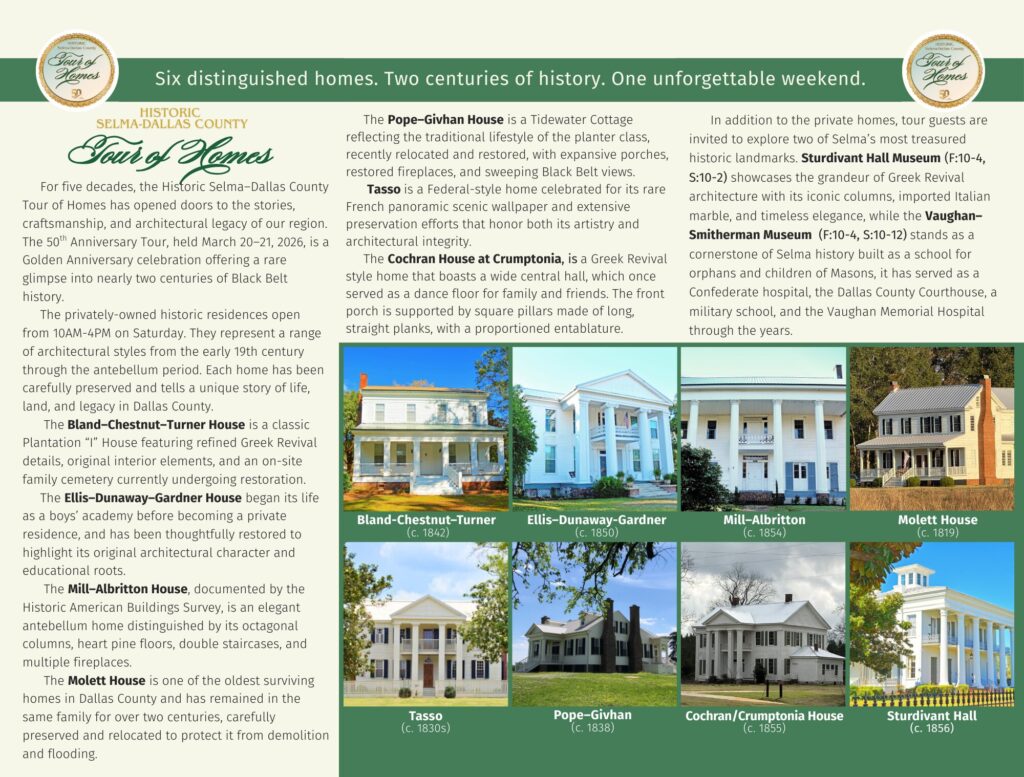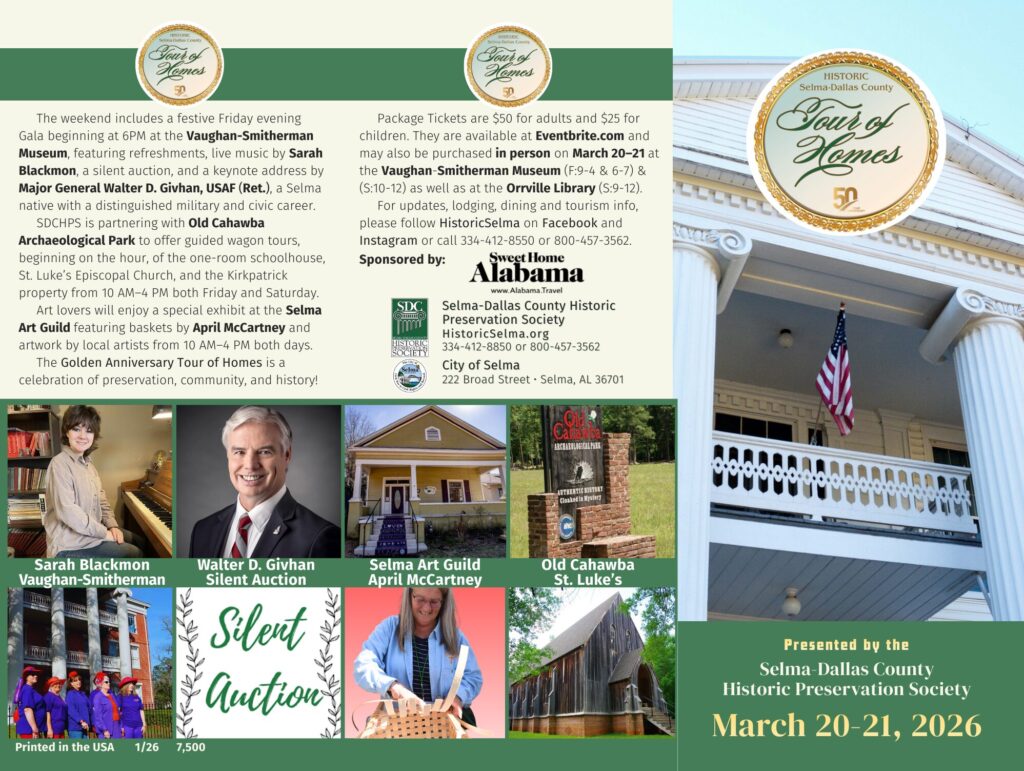 The Selma–Dallas County Historic Preservation Society invites the public to celebrate a Golden Anniversary at the 50th Annual Historic Selma–Dallas County Tour of Homes, taking place March 20–21, 2026, in Selma, Orrville, and West Dallas County.